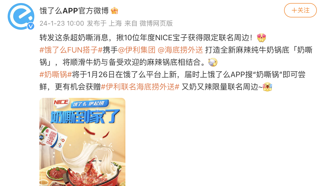 为了让此次联名事件快速高效地传递给目标群体,早在“奶嘶锅”推出之前,伊利脱脂纯牛奶携手海底捞外送 、饿了么在全平台共同预热,借助三方影响力,为本次跨界制造声量,实现1+1+1>3的协同效应,吸引了众多用户的关注。
