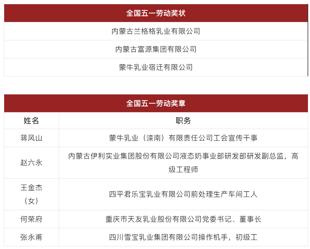 全国五一劳动奖和全国工人先锋号拟表彰人选(集体)公示,这些乳企和乳业人入选!